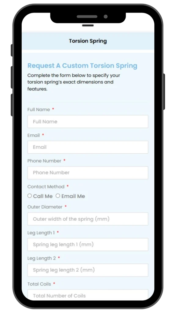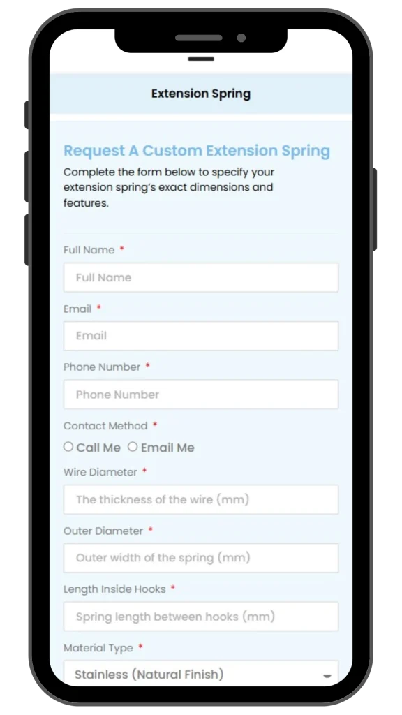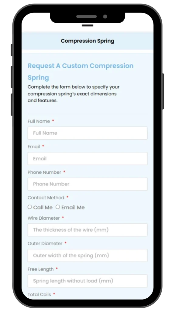 Once you’ve selected the type of spring, you’ll need to provide key specifications on the form. The fields available will depend on the spring type you’ve selected, but they typically include: